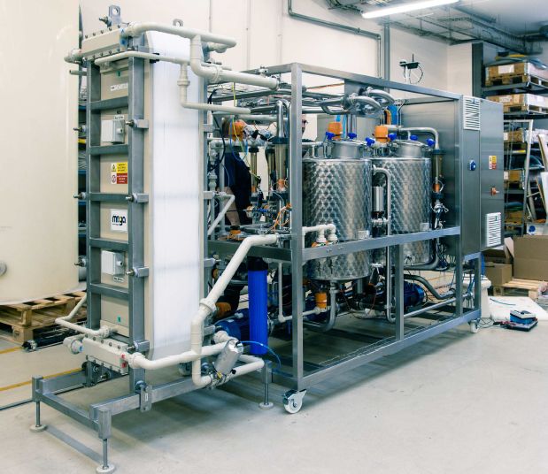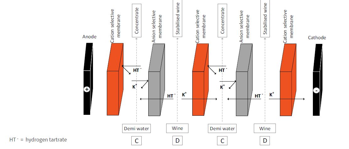 La electrodiálisis se basa en hacer circular el vino entre membranas bipolares de permeabilidad selectiva. El equipo monta un paquete de membranas de número variable entre las que circulan flujos de vino y agua alternativamente, quedando un ánodo (polo positivo) y un cátodo (polo negativo) en los extremos.